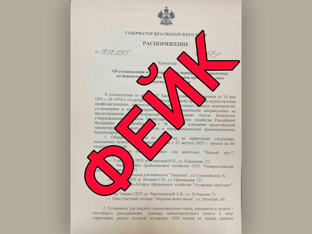 В оперативном штабе Краснодарского края предупреждают о распространении очередной фальшивки. Сообщается, что с 22 августа предположительно был введен карантин по бешенству животных в прибрежной зоне по распоряжению губернатора.