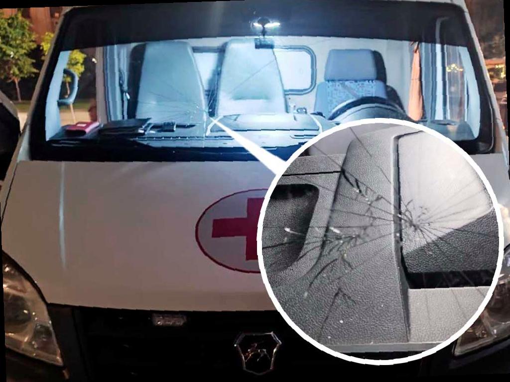 Когда бригада скорой готовилась уехать, мужчина подошел к автомобилю и начал бить по стеклу. В результате лобовое стекло не выдержало его напора.