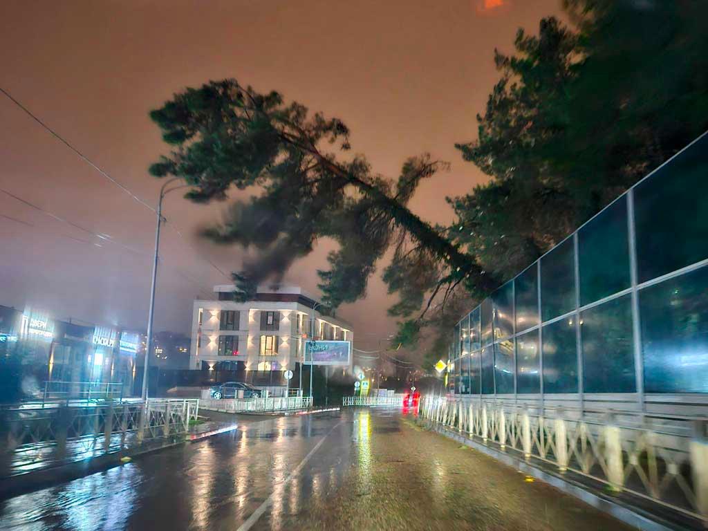 Были сообщения о падении деревьев в течение суток. Например, большая сосна упала в районе дома 20 на Тоннельной улице, другое дерево перекрыло улицу Егорова на спуске с «Ривьеры», автомобили пострадали на улицах Курортного проспекта и Санаторной, а дерево пробило крышу шаурмичной в центре города.