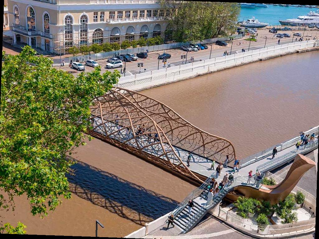 Это пятидесятиметровое сооружение было построено с применением «зеленых» технологий. Строители аккуратно работали, чтобы не навредить экосистеме реки. Дизайн моста вдохновлен формой осеннего листа — стальные трубы изогнуты в нескольких плоскостях, повторяя замысел 3D-художника.