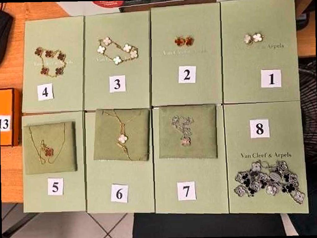 Экспертиза показала, что украшения с гравировками Cartier, BVLGARI, HERMES и другими изготовлены из сплава золота 750 пробы. Они содержат вставки из бриллиантов, оникса, перламутра и сердолика. А алмаз в носке весом 2 карата.