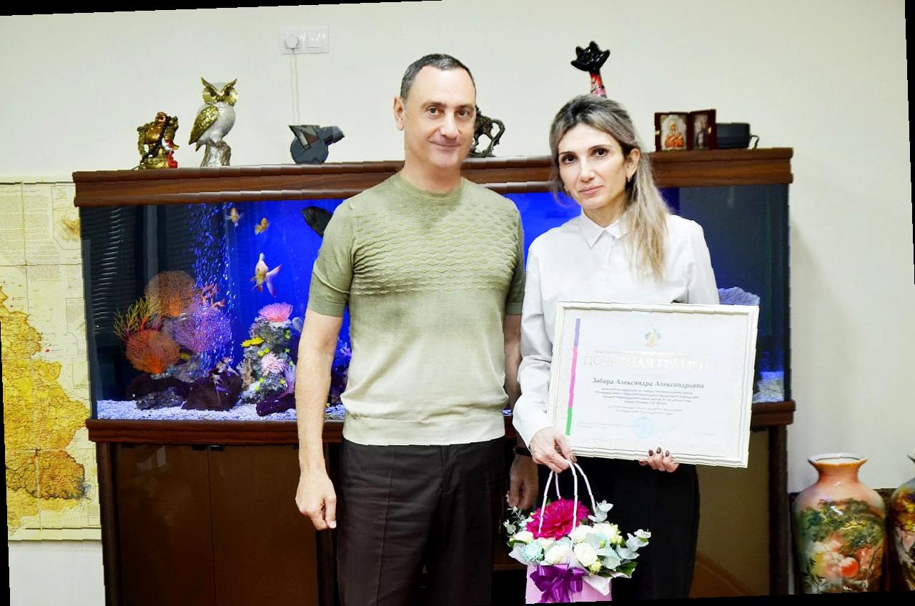Депутат Законодательного Собрания Краснодарского края, из фракции «Единая Россия», Виктор Тепляков вручил Почётные грамоты лучшим специалистам образования от имени председателя регионального парламента Юрия Бурлачко. Мероприятие состоялось в рамках работы по поддержке профессионалов, чей труд способствует развитию региона. На этот раз награду получили работники образования, в числе которых были заведующая детским садом №35 Елена Пивнева, директор гимназии №15 Виктория Панькова, заместитель директора по учебно-воспитательной работе школы №10 Александра Забара.