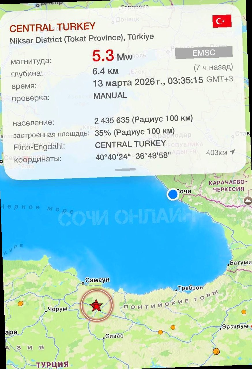 Ночью жители курортного города Сочи сообщили об ощущаемых подземных толчках — некоторые горожане даже проснулись от колебаний. По данным Европейско-средиземноморского сейсмологического центра, землетрясение произошло в 03:35, однако его эпицентр располагался в Турции — между городами Самсун и Сивас. Магнитуда землетрясения составила 5,3, а очаг залегал на глубине около 10 километров. Расстояние от эпицентра до Сочи — примерно 350 километров, поэтому в курортном городе были зафиксированы лишь слабые колебания силой около 2 баллов. Фото: Европейско-средиземноморский сейсмологический центр
